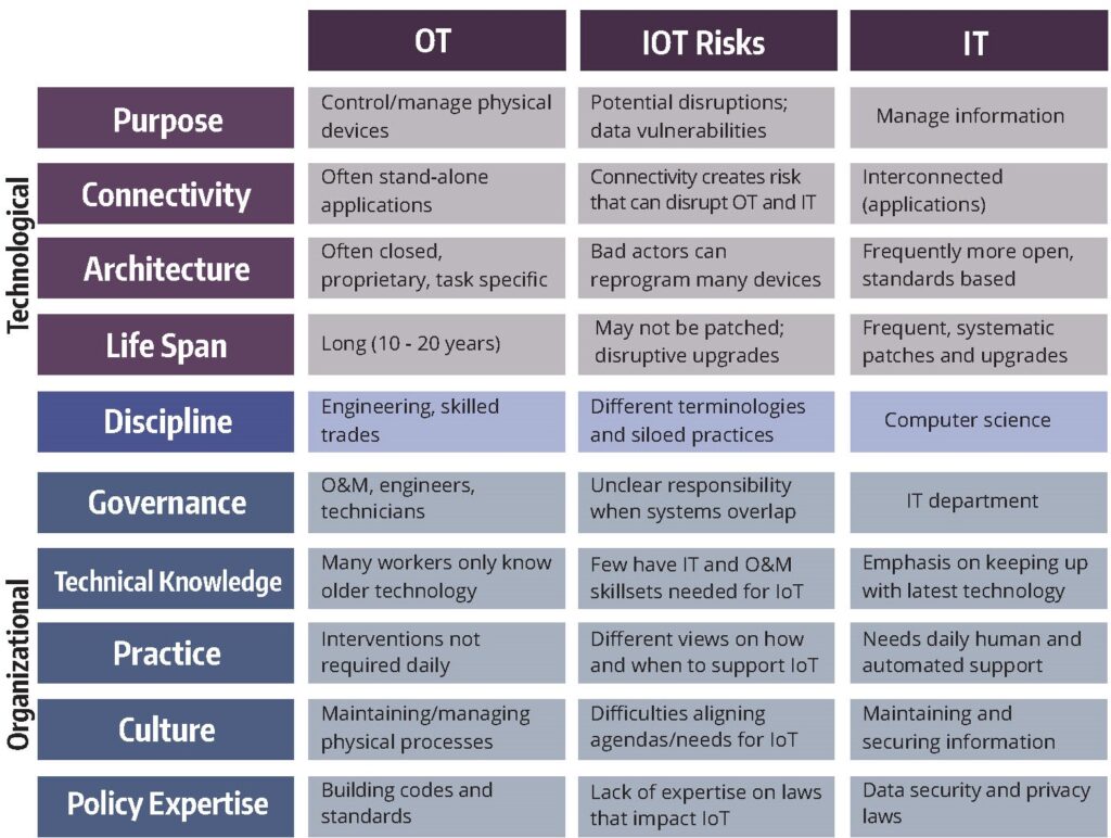 A foundational issue for cybersecurity in the built environment is the organizational friction generated from the increasing integration between two technological systems, Information Technology (IT) and Operational Technology (OT). This integration is often called IT/OT convergence. These two systems are embedded in the siloed institutional histories and work practices of the professional domains that historically managed the technologies of each system. OT is predominantly within the domain of engineering and skilled trades professions, often governed by a building’s Operations & Maintenance (O&M) department with manufacturing, installation, and maintenance companies that specialize in these systems. IT is a part of the computer science discipline and generally managed in an organization’s IT department, units with substantially different educational background and industry culture than O&M.